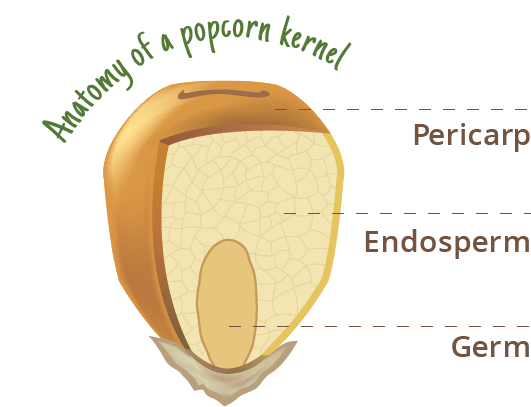 Popcorn needs heat to pop. Most popcorn will pop when the kernel's internal temperature reaches 400-460 degrees Fahrenheit. Bound within the endosperm or starch is moisture. When the kernel is heated, the moisture turns to steam. Because the pericarp or hull is hard and flinty, pressure builds up within the kernel. The starch inside the kernel becomes soft like gelatin and the moisture vaporizes until the pressure in the kernel reaches 135 pounds per square inch. The pressure increases until the pericarp or hull ruptures and the gelatinized starch granules puff out. The kernel literally turns inside out. The starch or endosperm is the white part of the popped kernel and the pericarp or hull is the darker, flaky bit at the center of the kernel.